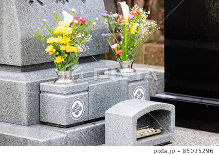 雨に濡れる白い墓に供えられた花と燃え尽きた線香の写真素材85035296- PIXTA。
