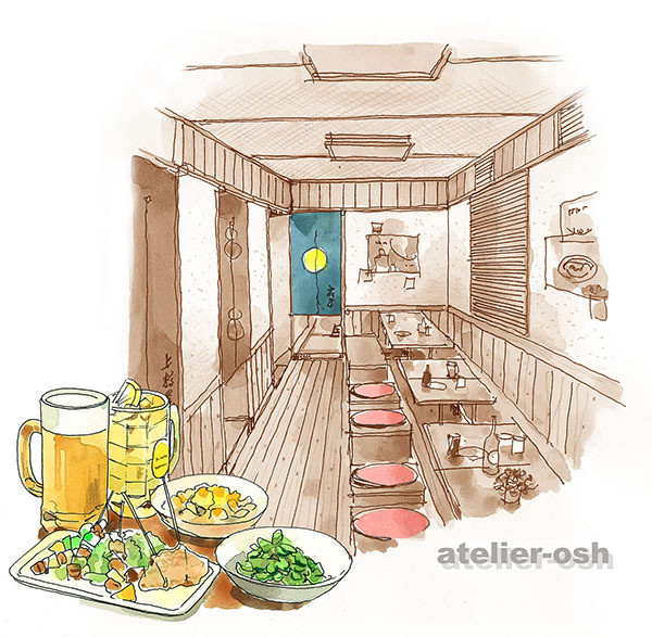 忘年会・新年会 ちらし・案内状 水彩イラスト建築パースなら大阪のアトリエオッシュ手描きの水彩画。