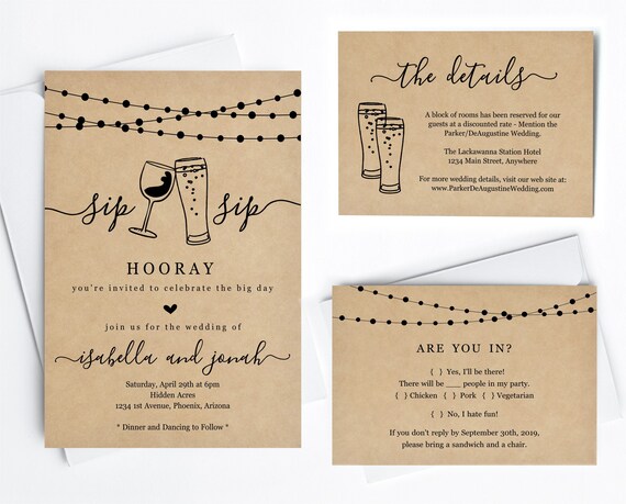 楽しい結婚式招待状テンプレート - Sip Sip Hooray 面白いワイン&ビールの印刷可能なセット - 素朴なクラフト紙インスタントダウンロード PDF スイート - ライト - Etsy 日本。
