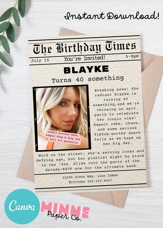 面白い新聞の誕生日招待状:編集可能な5x7招待状 デジタルダウンロード- Etsy 日本。