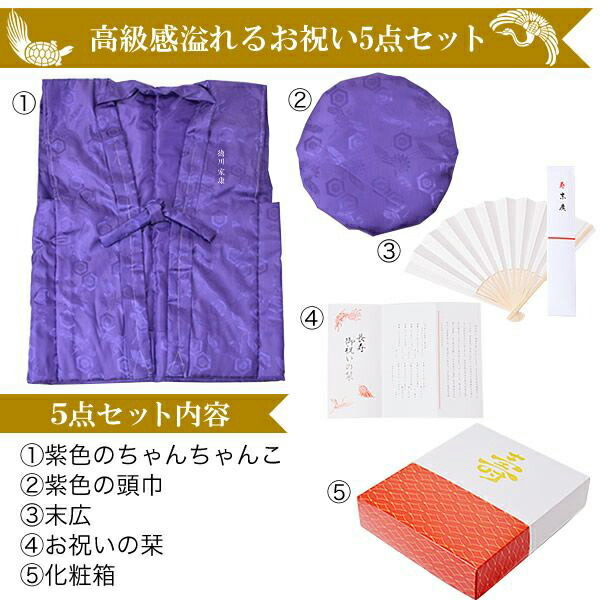 名入れ刺繍 ちゃんちゃんこ 長寿 紫色古希祝い・喜寿・傘寿・卒寿お名前刺繍入り 長寿祝い 古希70歳・喜寿77歳・傘寿80歳・卒寿90歳ちゃんちゃんこセット ネーム刺繍入りのちゃんちゃんこと大黒頭巾と末広にお祝いの栞と化粧箱の5点セット<R> メール便不可。