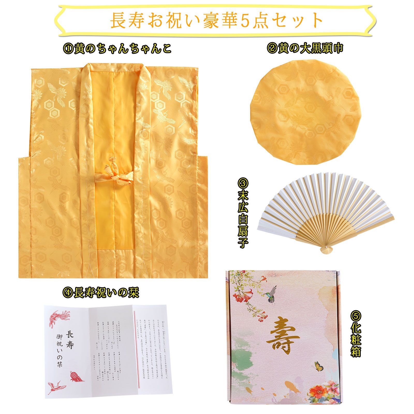 傘寿・米寿・卒寿祝い黄色 長寿祝い ちゃんちゃんこセット お祝いセット ちゃんちゃんこと大黒頭巾と末広にお祝いの栞と化粧箱の5点セット 送料無料メール便不可京都きもの町。