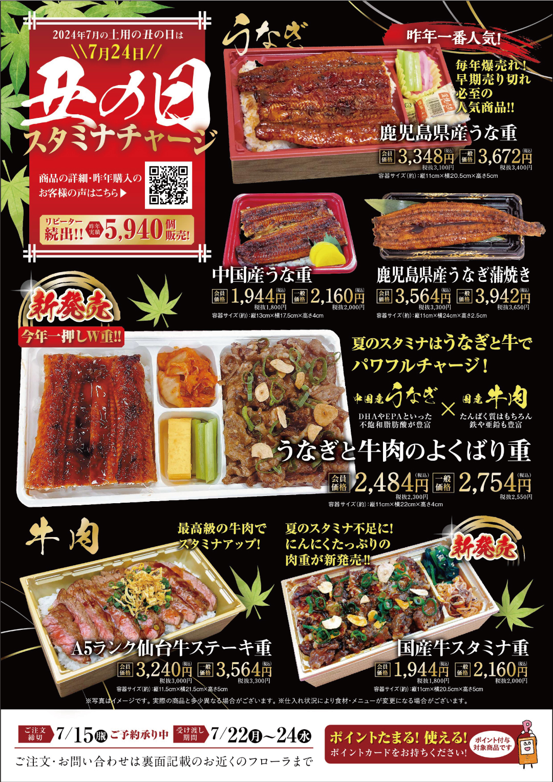 2024土用の丑の日 うな重・牛スタミナ重のご案内 -公式 株式会社フローラ。