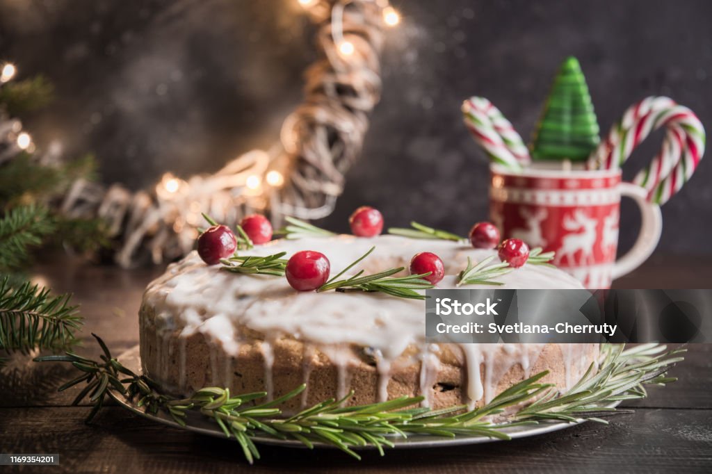 自家製のクリスマスケーキはプレート上のクランベリーとローズマリーを飾りましたクローズアップホリデーフード - お祝いのストックフォトや画像を多数ご用意- iStock。
