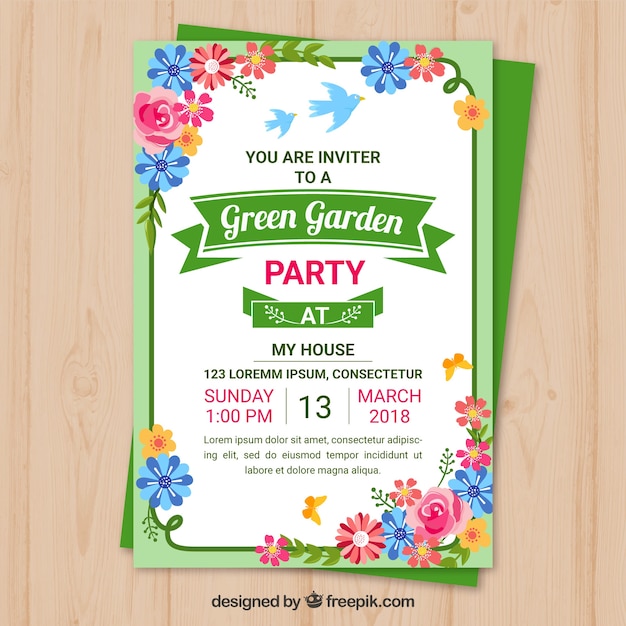美しい花とガーデンパーティー招待状テンプレート無料ベクトル素材。