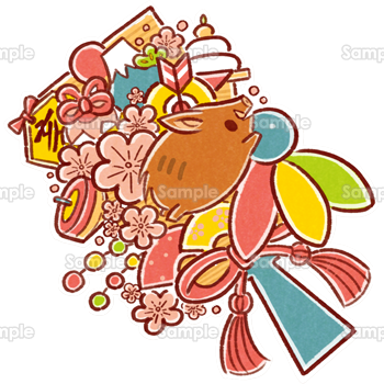 縁起物と正月飾りとイノシシ無料イラスト年賀状プリント決定版 2026。