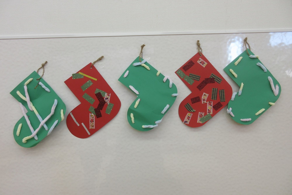 クリスマス製作~壁面装飾にも!ヒモ通しで靴下を作ろう~。