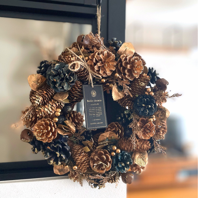 クリスマスリース 2023 ドア飾り 玄関 大きめ Lサイズ お洒落 北欧 松ぼっくり シック ゴールド。