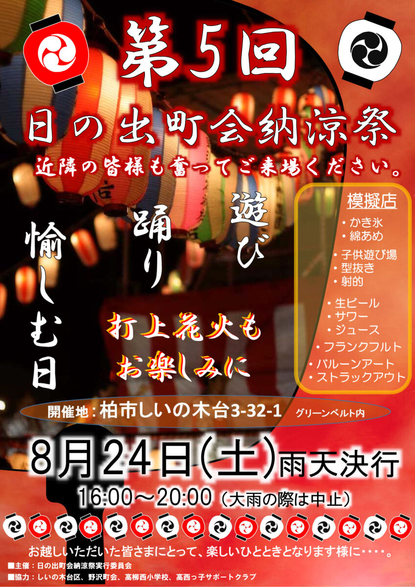 8 24 土 しいの木台3丁目グリーンベルト内にて「第5回 日の出町会納涼祭」が開催、各種模擬店、盆踊り、打ち上げ花火 2024- 柏つうしん -千葉県柏市の地域情報ブログ。