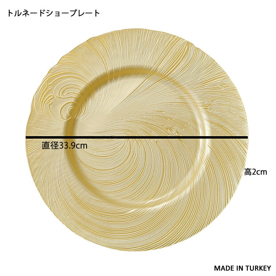 トルネード ショープレート 直径約34cm 金 ゴールド 飾り皿 位置皿 化粧皿 決め皿 大皿 高品質 綺麗 テーブルコーディネート ガラス パーティ高級レストラン ゴージャス ウェディング 食器 トルコ製 陶器のふる里 trys光。