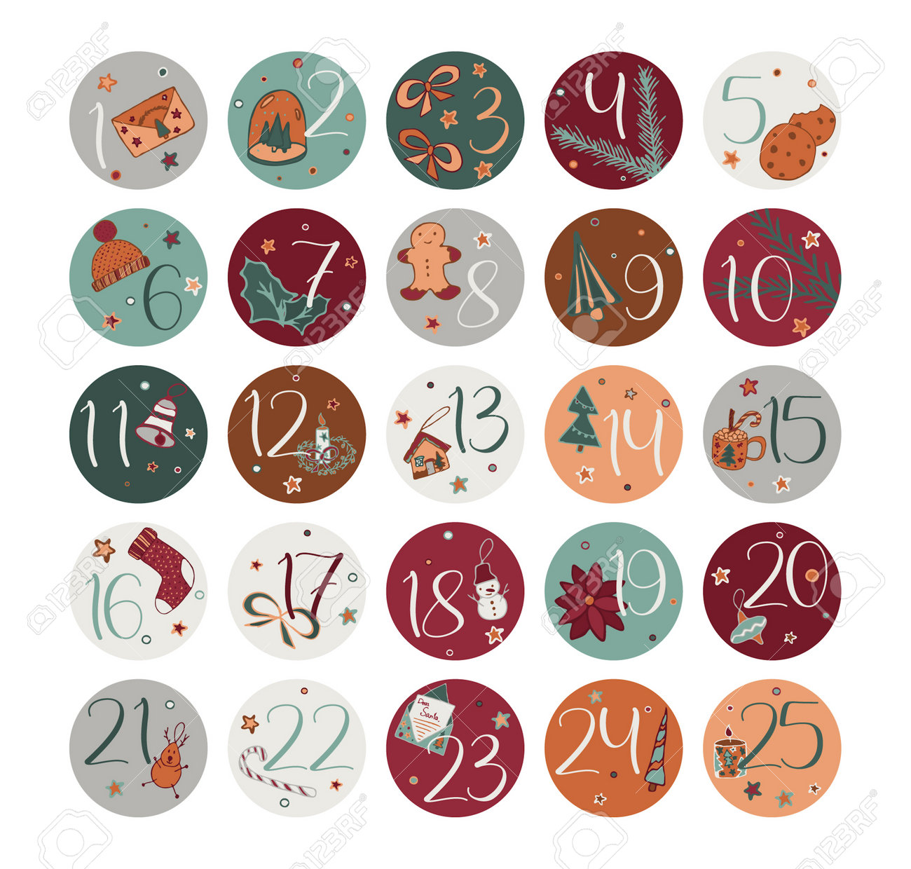 クリスマスアドベントカレンダー。手描きの要素と数字。○冬季休業カレンダーカードはデザイン、ベクターイラストをセット。のイラスト素材・ベクターImage 89630335。