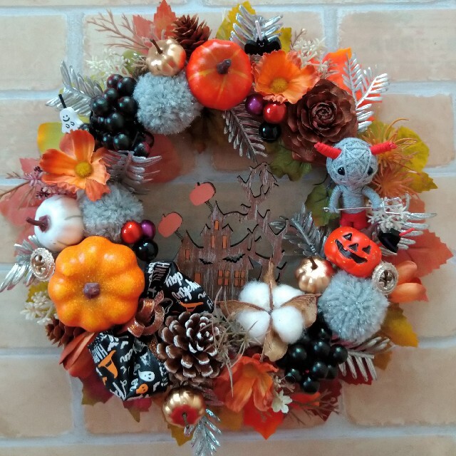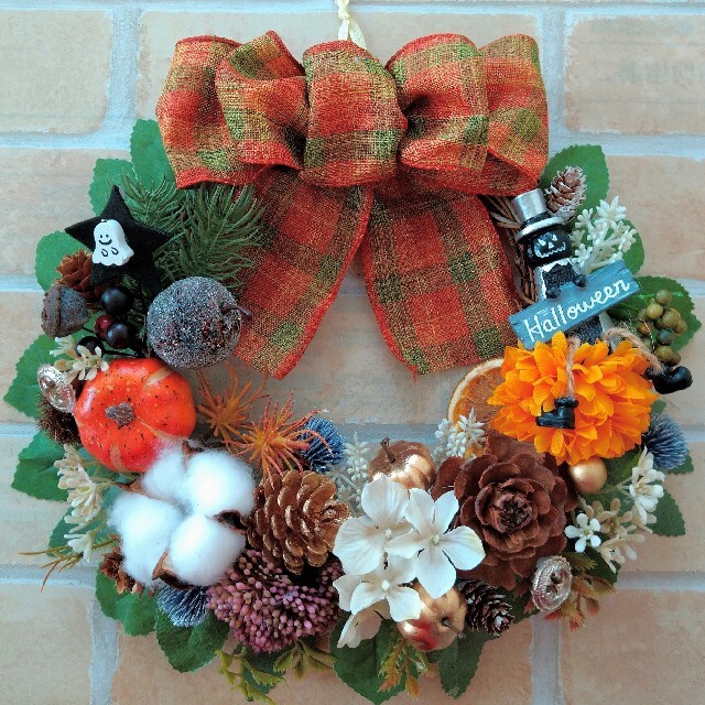パンプキン&松ぼっくりの秋リース ハロウィン 玄関飾りiichi 日々の暮らしを心地よくするハンドメイドやアンティークのマーケットプレイス。