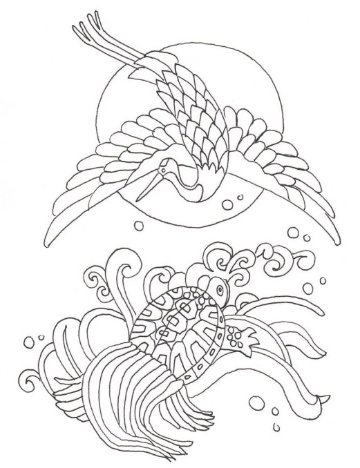 鶴と亀の、長寿を願う吉祥塗り絵です。ぬりえラボ。