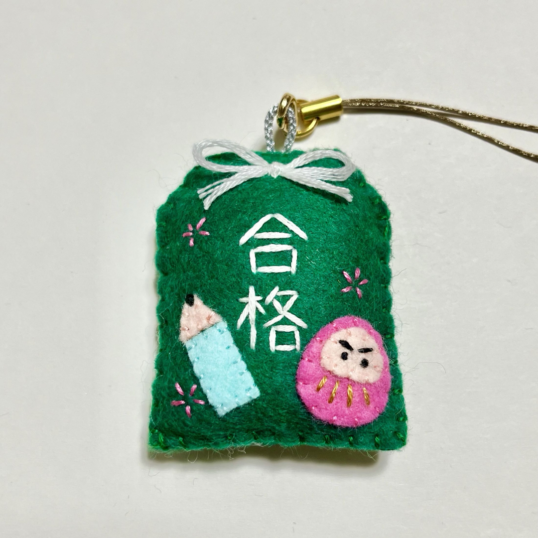 ♡合格 お守りフェルト ストラップ☆だるま付 緑 の通販 by Karina's shopラクマ。
