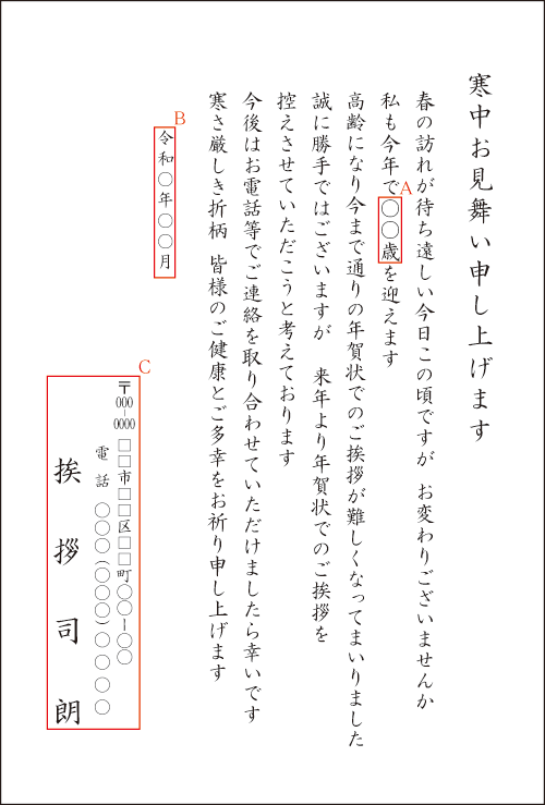 寒中見舞いのメッセージ例文集!イラスト例などをケース別に紹介手紙の書き方・文例All About。