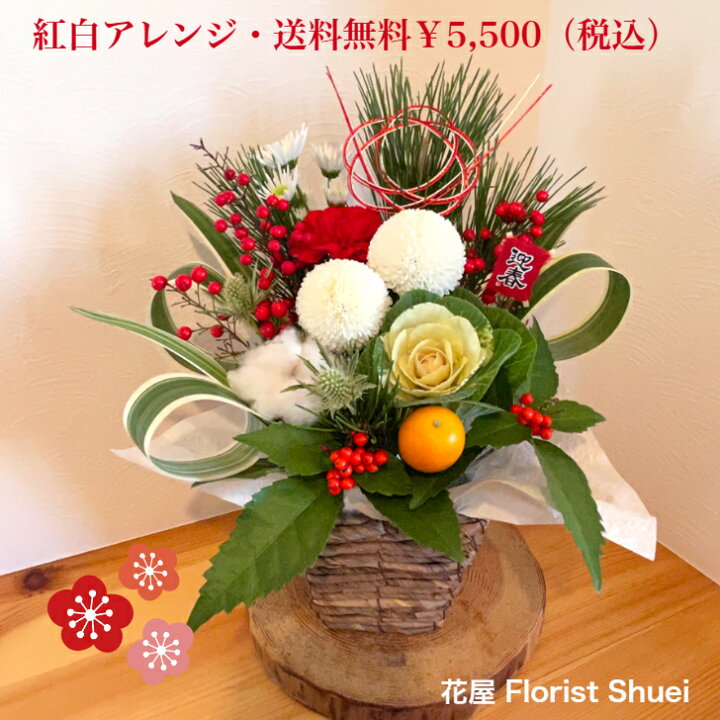 楽天市場送料無料 2025カレンダー付き謹賀新年 紅白 お正月アレンジメントフラワーギフト 正月 花 正月飾り 玄関 おしゃれ モダン 生花迎春 アレンジ お正月 お花 フラワーアレンジメント アレンジメントフラワー お正月飾り お年賀 花 年末年始 ギフト花屋。