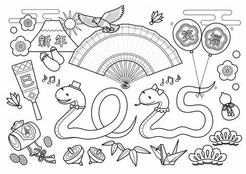 冬・お正月・ぬり絵・ワーク 巳年のお正月のハッピー塗り絵フタバのフリーイラスト。