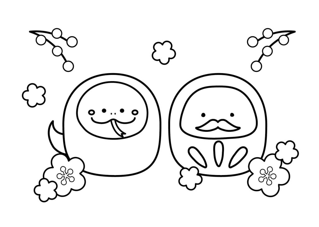 お正月塗り絵無料2025年巳年かわいい1月塗り絵お正月イラストダウンロード無料ダウンロード!保育教材イラスト無料型紙。