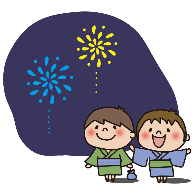 浴衣を着た子どもたちと花火のイラスト無料のフリー素材 イラストエイト。