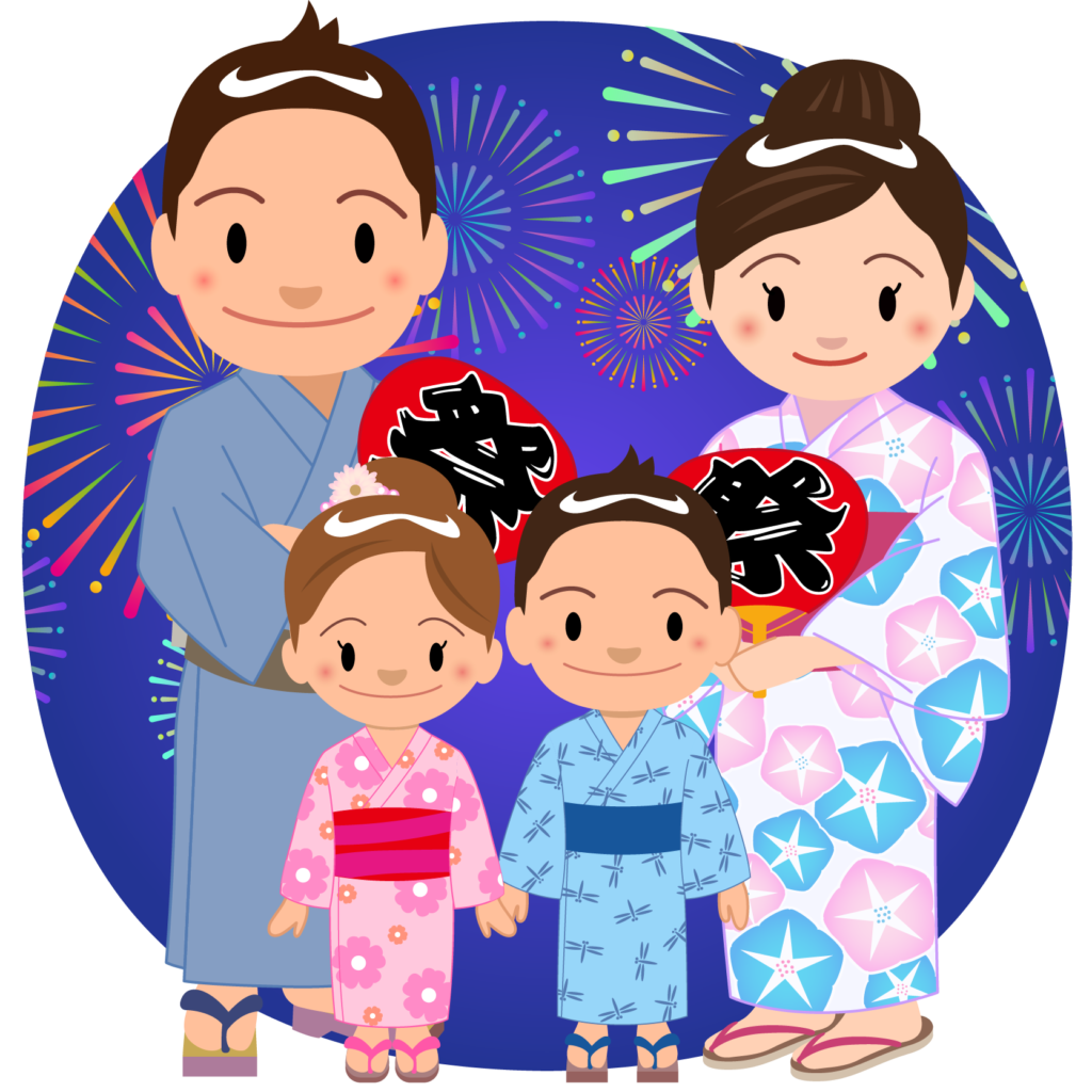 夏祭りのイラスト 打ち上げ花火を眺める浴衣姿の家族無料フリーイラスト素材集 Frame illust。
