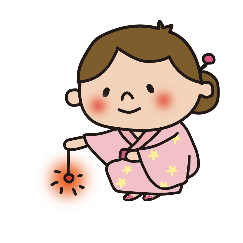 浴衣を着て線香花火をする子供 女の子 の無料 フリー イラストかわいい手描きの無料素材「てがきっず」保育園・小学校・介護施設にぴったりのフリー素材 イラスト。