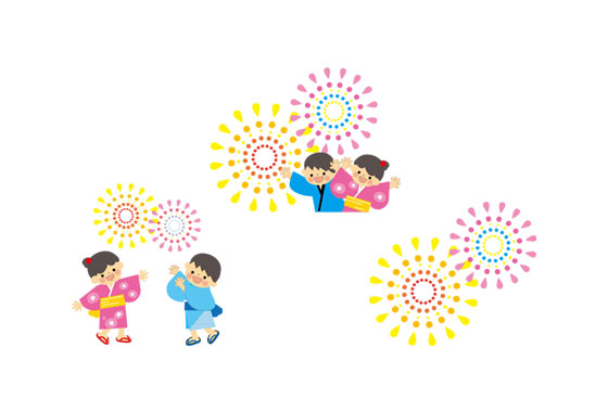 フリー素材浴衣を着た子供達の楽しい花火大会を描いたフリーイラストセット。