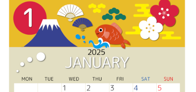 2025年1月縦型の月曜始まり 和風な新春イラストのかわいいA4無料カレンダー素材デザイン王。