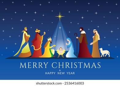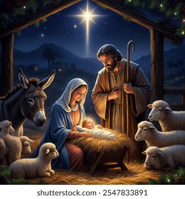 伝統的なキリスト教のクリスマス降誕祭マリアとヨセフのシルエットと頭の上にベツレヘムの星を持つ赤ん坊のイエスの棺のシーン。」のイラスト素材2218007897Shutterstock。