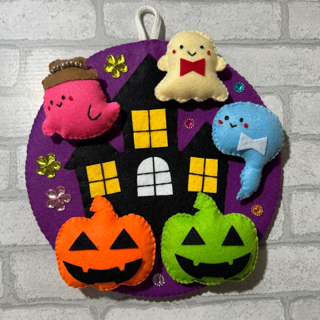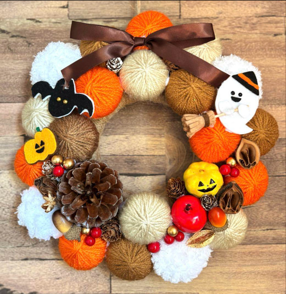 ハロウィンリース 壁掛け 毛糸玉リース フェルト ハンドメイドリース インテリア ハロウィン ポンポン 秋リース オータムリース。