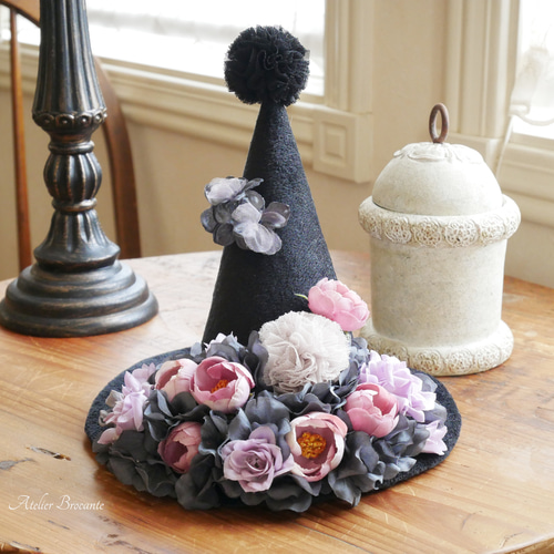 ハロウィン!! 魔女の帽子のアレンジ・フリフリ&ポンポン ベロア調 ハロウィンインテリア かぼちゃを添えて アートフラワー AtelierBrocante 通販 16528053Creema クリーマ。