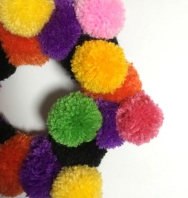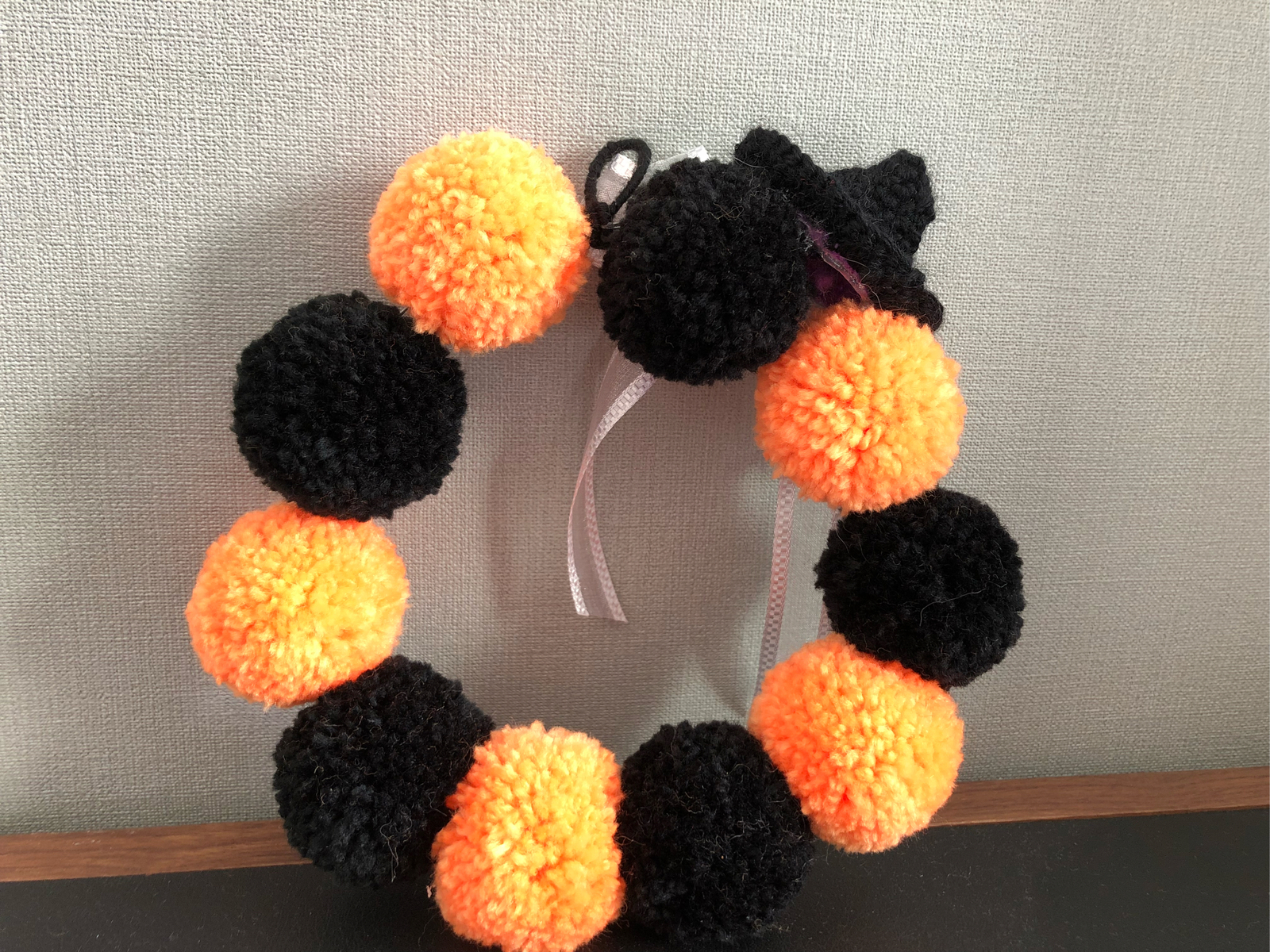 ポンポンでハロウィンリースを作ってみました。ポンポンをつなぐだけ。