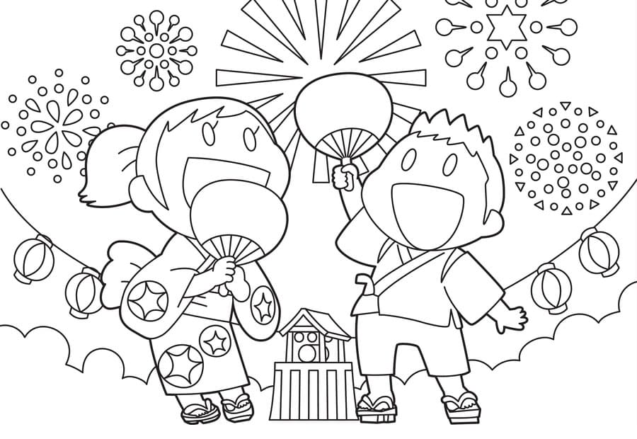 7月・8月にぴったり!夏祭りの塗り絵笑顔の二人と花火保育園でも使える無料ダウンロード。