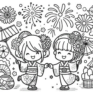 夏祭りの塗り絵:浴衣の子どもたちイラスト・フリー素材なら「シンテリ」。