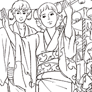 夏祭り無料ぬりえ みんなで盆踊り!浴衣姿の楽しいぬりえ素材無料ぬりえ 家庭・保育・介護で使える!印刷して楽しめる塗り絵サイト「ぬりえん」。