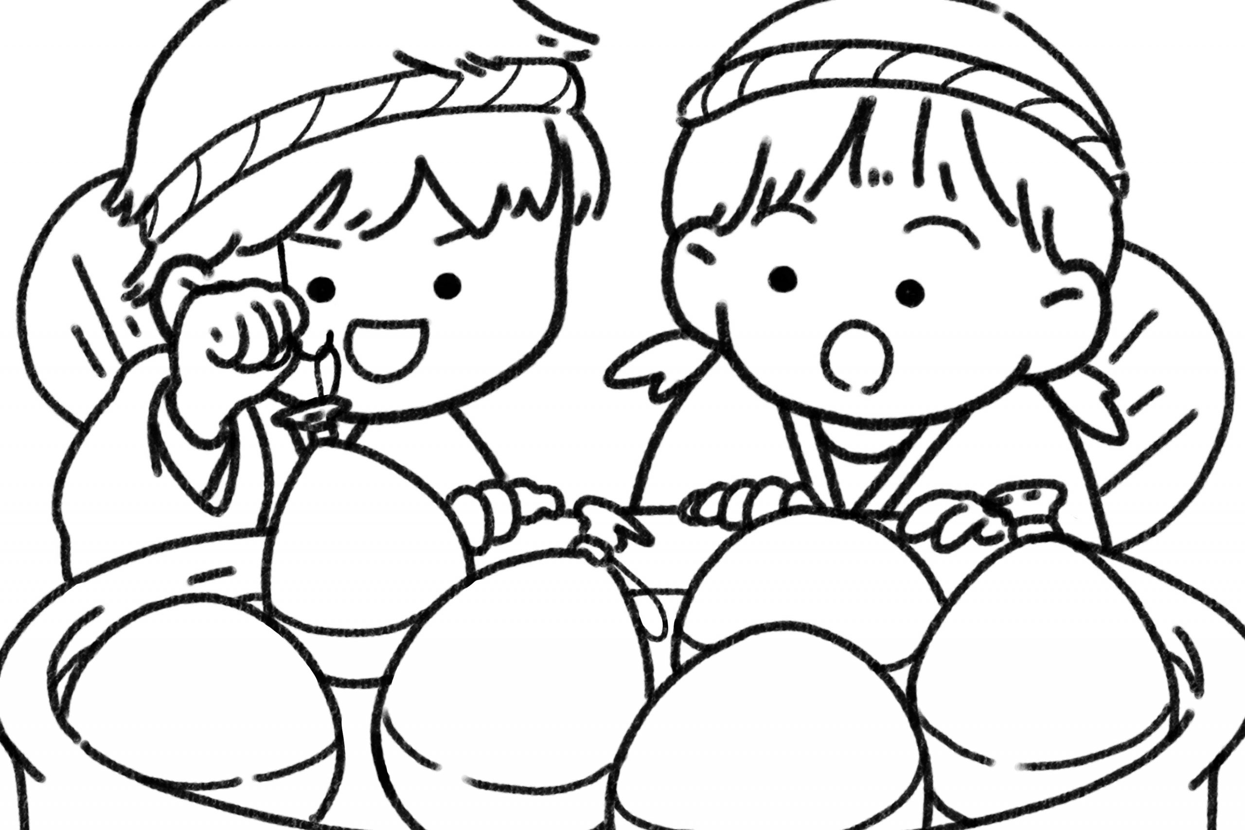 夏祭り・とうもろこしと団扇のイラスト ぬりえ子供と動物のイラスト屋さん わたなべふみ。