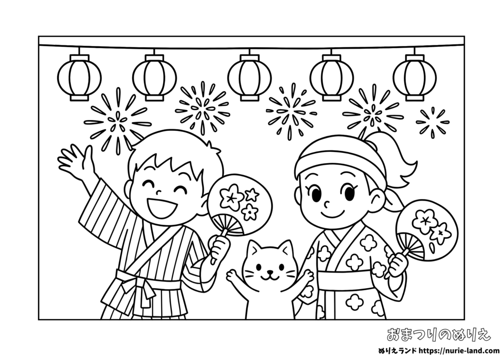 ネコちゃんの夏祭り」の塗り絵 - ぬりえやさんドットコム。