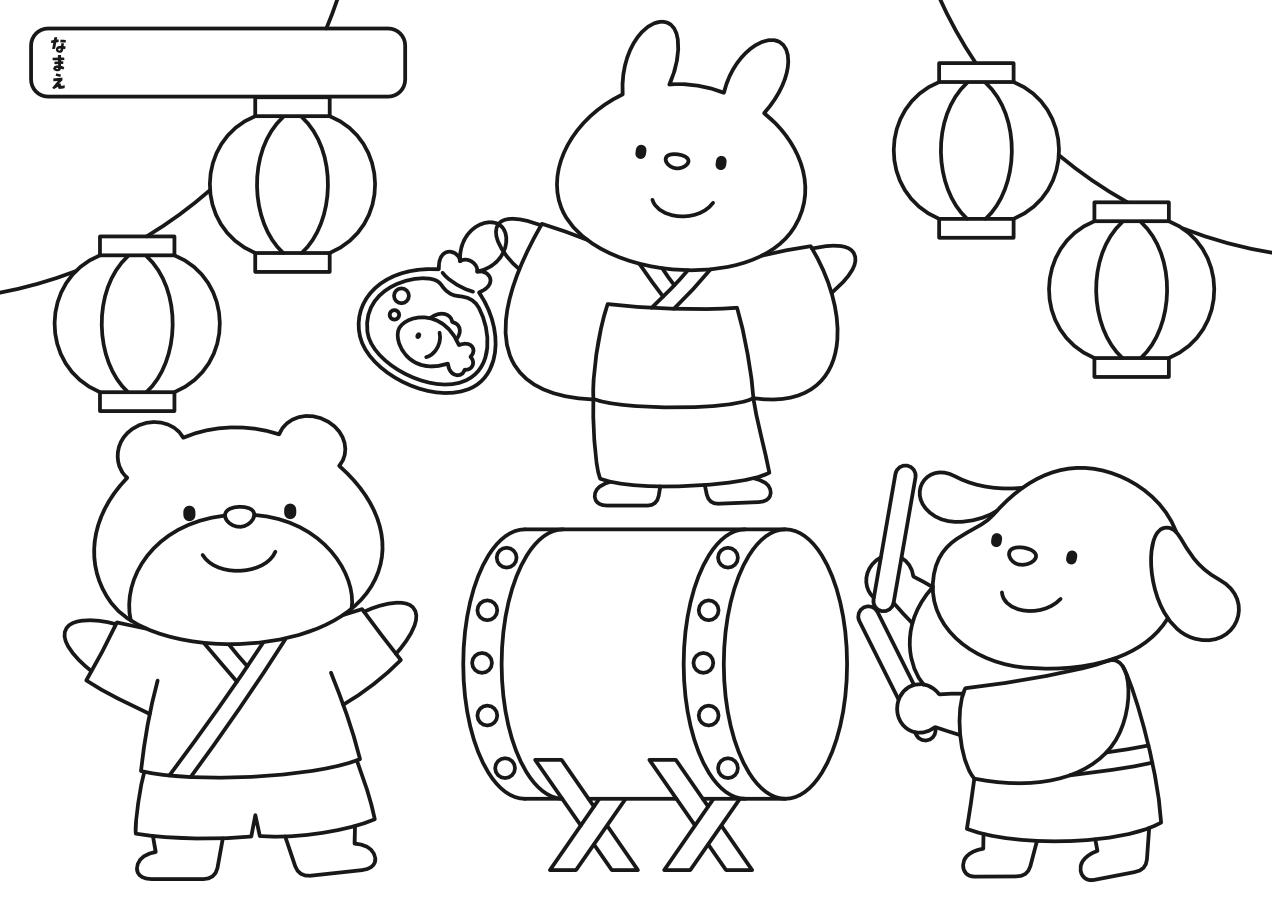 ぬりえ どうぶつたちの夏まつりほいくえ。