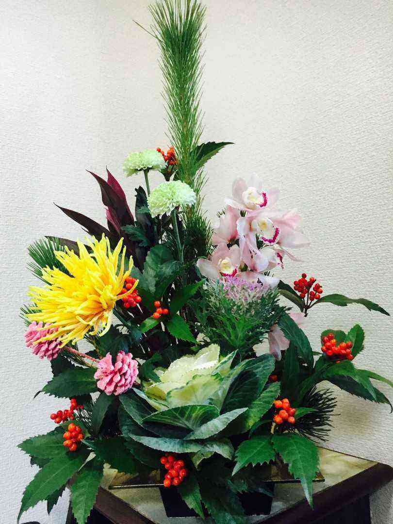 お正月花 大王松と百合や蘭で華やかなアレンジメント風生け花お花選びのコンシェルジュ。