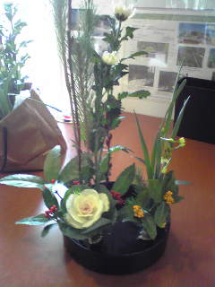 The Ikebana Workshop - 私のデモ作品。正月花を基本立真型 盛花でいけました。後ろいけの為、完璧ではありません。 花材:マツ、ウメ、ナンテン、バラ、シンピジウム My demonstration work. New Year's Ikebana in BasicUpright Style Moribana. Arranged from behind。