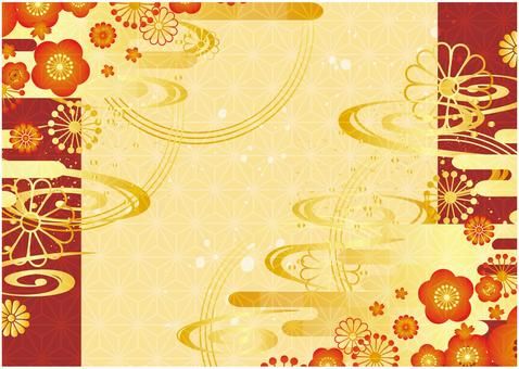 日本の正月背景デザイン 金箔と梅と菊と松。