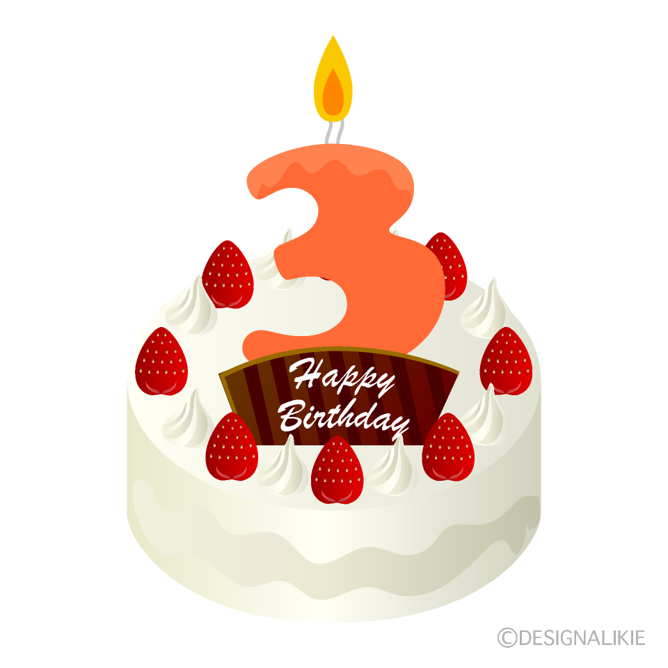 3才の誕生日ケーキイラストのフリー素材イラストイメージ。