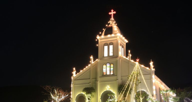 イルミネーション輝く天草の教会のクリスマスイブのミサに参列するクリスマスを過ごしませんか?TRAVELIO トラベリオの旅。