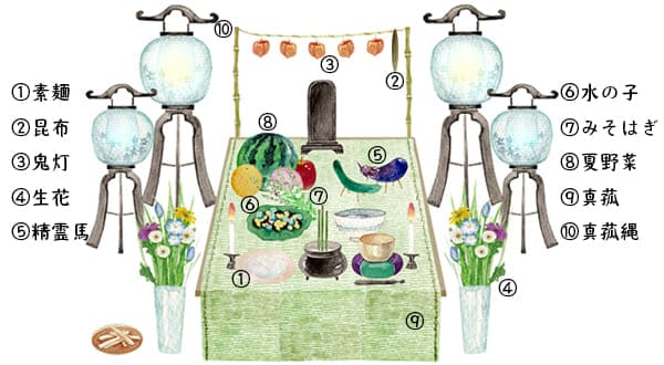 図解 2025年最新!お盆の飾り方は?精霊棚やお供え、初盆との違いもイラスト解説。