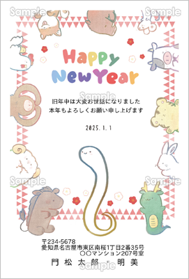 ヘビとゆるかわいい十二支イラスト-カジュアルテンプレート年賀状プリント決定版 2026。