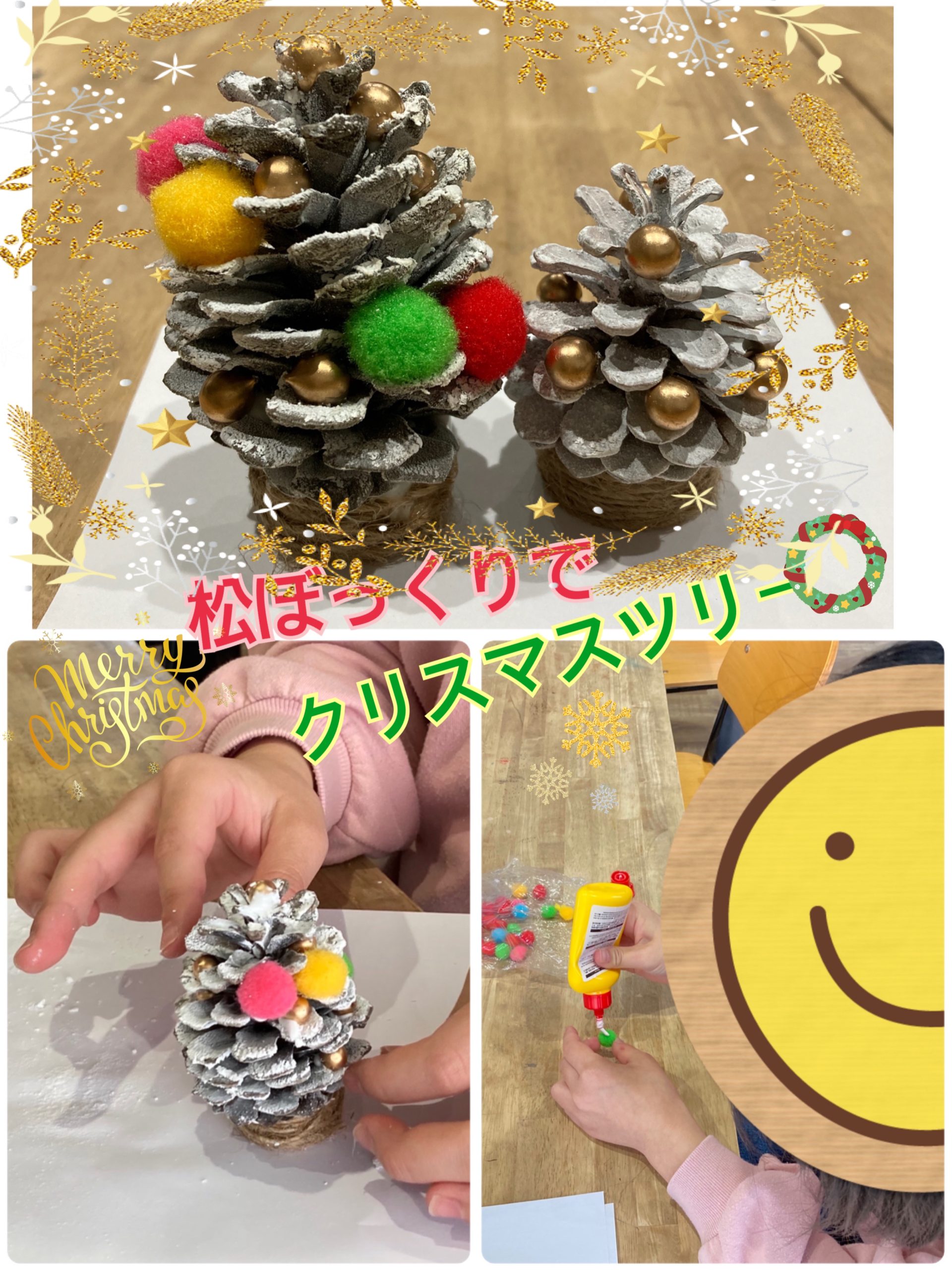 アトリエ☆どんぐりこども絵画造形教室 クリスマス課題 大きな松ぼっくりでクリスマスツリーをつくろう! みんなでクリスマス ソングを口ずさみながらつくりました🎶。