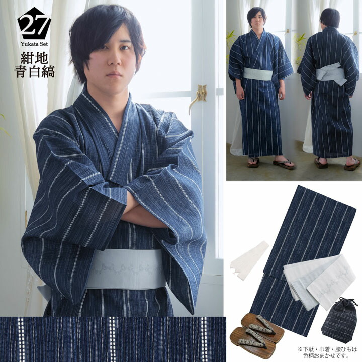 浴衣 セット メンズ 男性用浴衣セット 浴衣5点セット 浴衣+角帯+下駄+巾着+腰紐「綿麻 しじら織り浴衣 縞・格子・絣 全17柄」 S M LLL サイズ 綿麻浴衣 花火大会 夏祭り フェス 男性用 男性浴衣 ゆかた yukata送料無料メール便不可京都きもの町。