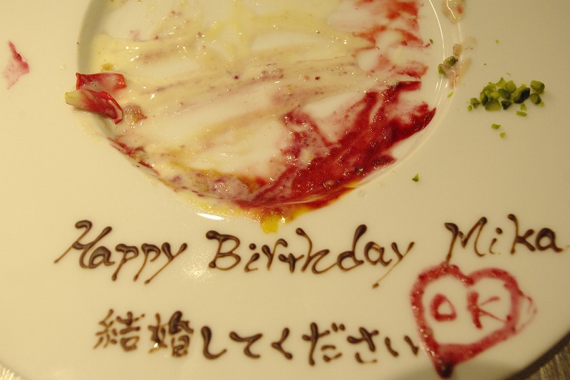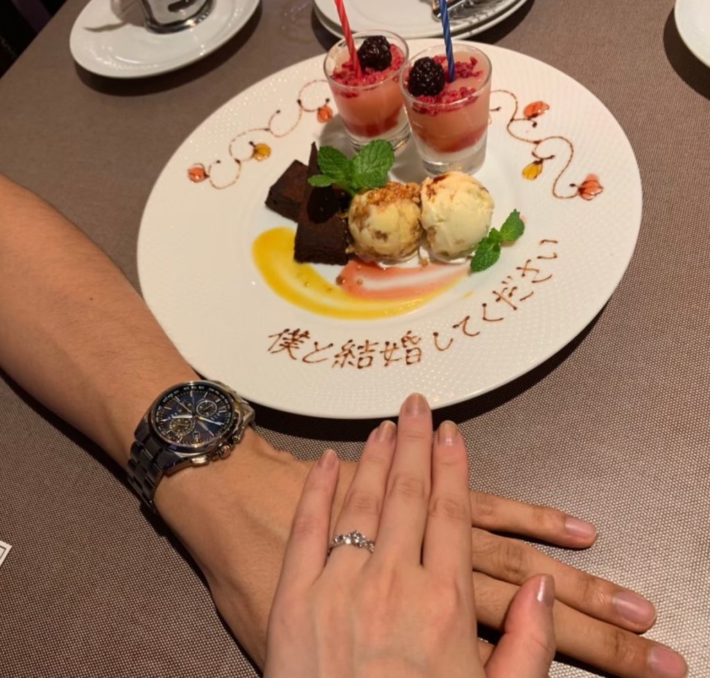 ディナーの最後、デザートプレートに書かれたプロポーズの言葉・ 宇部市Nさま♡山口県下松市ブライダルジュエリーフジタ。