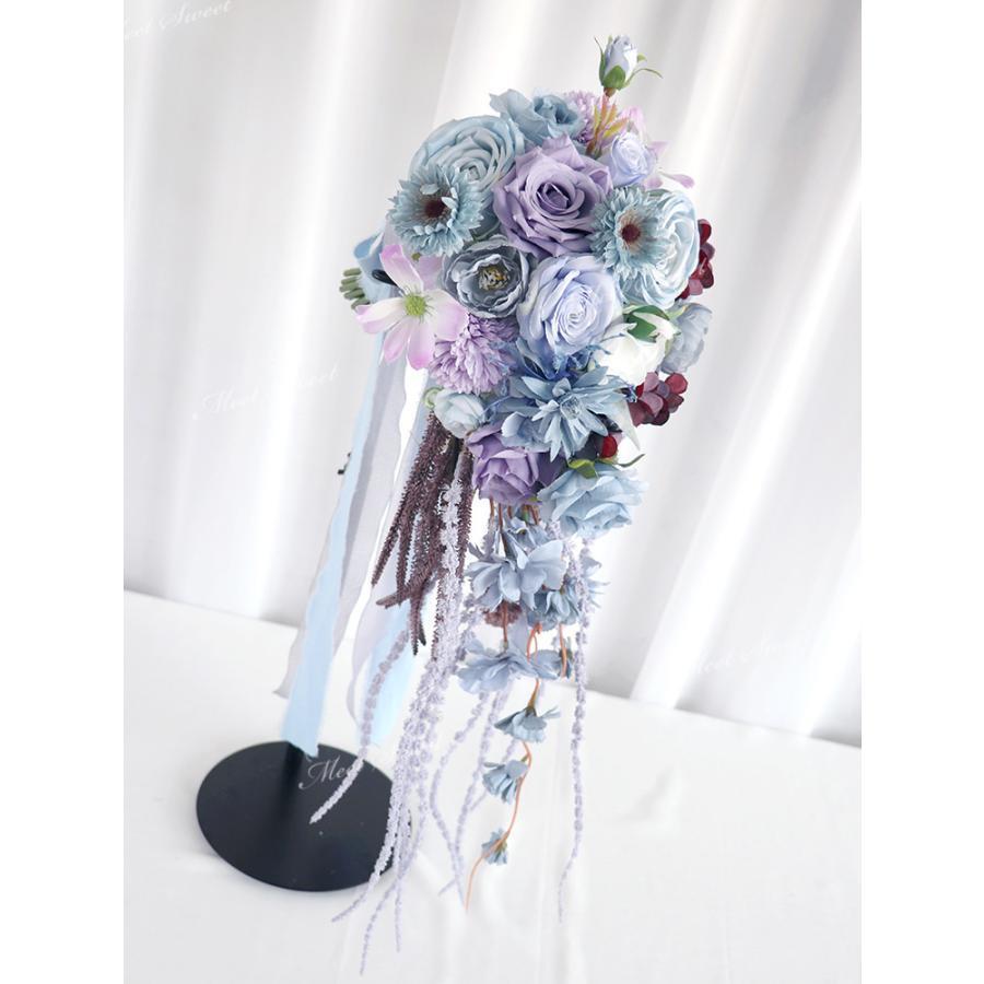 ウェディングブーケ ClassicalModern サムシングブルーのウェディングブーケ ブートニア付き 造花のブーケ– &YOUKAENアンドユーカエン。