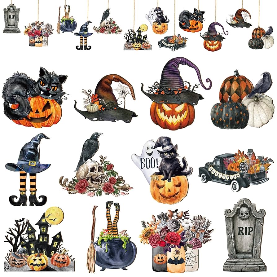 Huwena 36個 ハロウィン木製オーナメント 木用 ヴィンテージ ハロウィンオーナメント 木製 ハロウィン 吊り下げ装飾 パンプキン 魔女 黒猫木の切り抜き ロープ付き ホームパーティーの装飾用魔女の帽子。