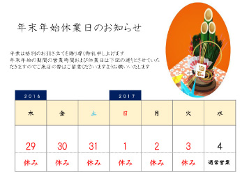 年末年始の営業カレンダーです!年末年始営業年末年始休業カレンダー年末年始カレンダ。